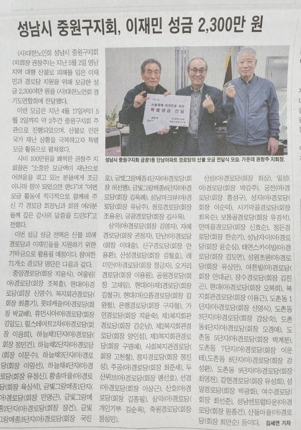 보도 자료는 아래 제목을 클릭하시면 기사 페이지로 이동합니다. [경기실버신문] 대한노인회 성남시 중원구지회, 산불 피해 이재민 위한 성금 2,300만 원 전달